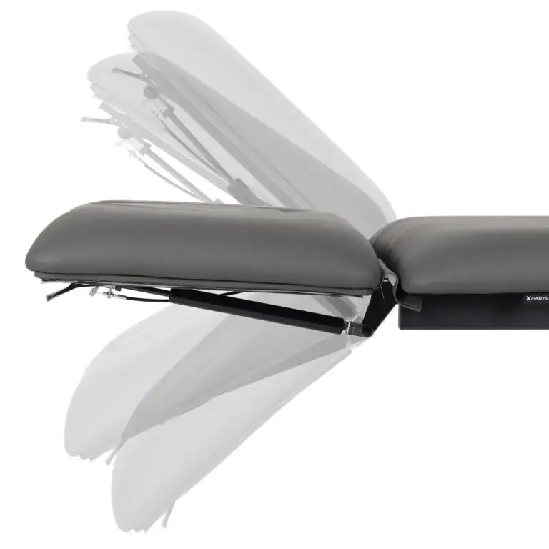 Table de soin se distingue par un mécanisme d’inclinaison parfaitement maîtrisé, offrant une polyvalence exceptionnelle pour s’adapter à chaque pratique professionnelle. La section centrale, présentée ici à travers plusieurs positions superposées, met en évidence une cinématique fluide et précise, idéale pour les soins nécessitant un ajustement millimétré de l’angle de travail.
